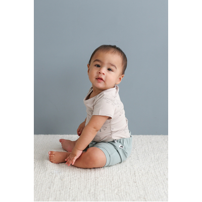 Keywords: organic baby shorts, blue baby shorts, comfortable baby clothing, soft cotton shorts, ethical babywear, breathable babywear, New Zealand-designed baby fashion