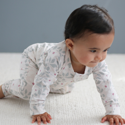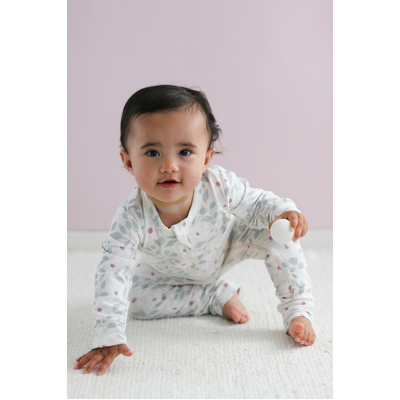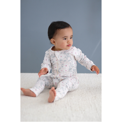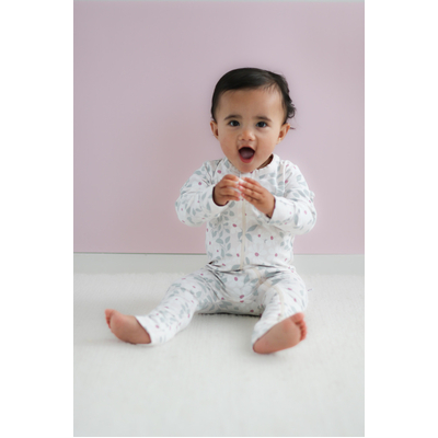 For cooler days, the Bellis Long Sleeve Zip Suit is a cozy and stylish option. Made from 95% organic cotton and 5% elastane, this zip suit features a beautiful pastel floral vine print in ivory, blush, and hazy blue. The long sleeves with fold over cuffs on the hands and feet provide warmth, while the easy two way zip closure ensures simple dressing. This suit offers comfort and versatility, perfect for both lounging and playtime.