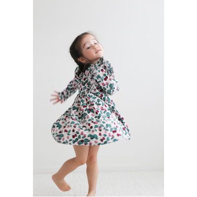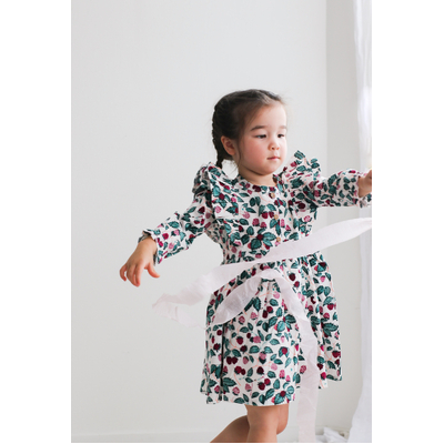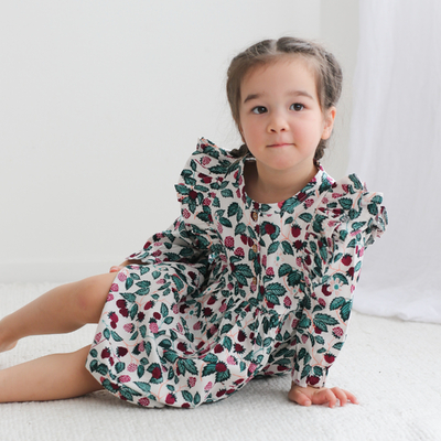 The Berry Nice Hazel Long Sleeve Dress is a timeless piece crafted from 100% organic cotton poplin, ensuring a lightweight yet structured feel. Featuring a gorgeous boysenberry print of rich deep reds, luscious greens, and delicate blossoms on a soft pale blush background, this dress is perfect for special occasions or everyday adventures. Designed in New Zealand and ethically made in India, it’s a beautiful combination of sustainability and style. Keywords: organic cotton dress, floral baby dress, long sleeve baby dress, sustainable children’s clothing, ethically made babywear, berry print dress