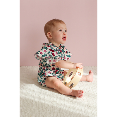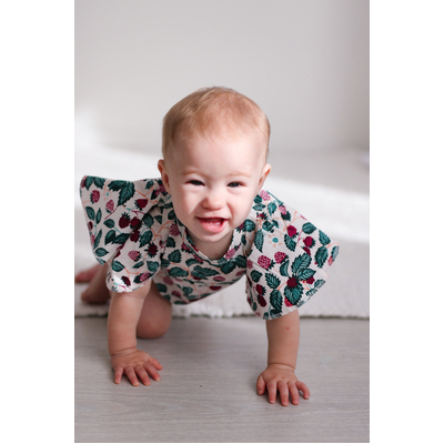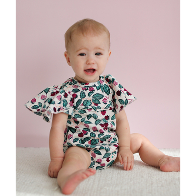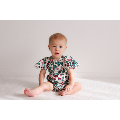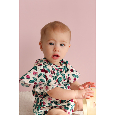 The Berry Nice Luna Romper is a charming one-piece that blends comfort with style. The floaty butterfly sleeves will give protections from the sun all while looking super cute! Crafted from 100% organic cotton poplin, the boysenberry print features rich red berries, soft blossoms, and lush green vines on a pale blush background, creating an elegant yet playful look. With a relaxed fit and breathable fabric, this romper is perfect for little ones on the move. Designed in New Zealand and ethically made in India, it’s a beautiful and sustainable addition to any wardrobe. Keywords: organic cotton romper, floral baby romper, berry print babywear, sustainable toddler clothing, ethically made romper, nature-inspired baby clothing