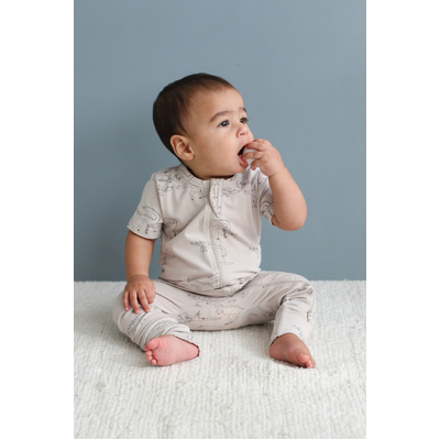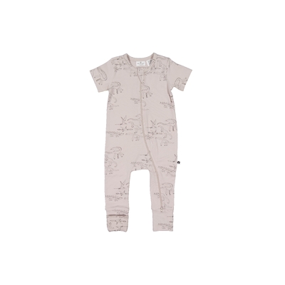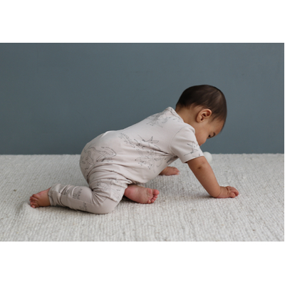 The Dino Roar Short Sleeve Zip Suit is the perfect combination of comfort and fun. Made from 95% organic cotton and 5% elastane, it offers a gentle stretch for all-day movement. The hand-drawn dinosaur illustrations, exclusively created for Burrow and Be by 9-year-old Remi, bring a unique edge to traditional dinosaur prints. The full-length two way zip ensures quick and easy changes, The warm beige-grey fabric makes this an everyday essential.