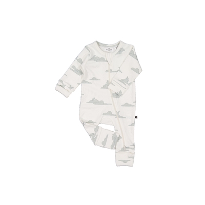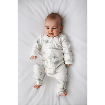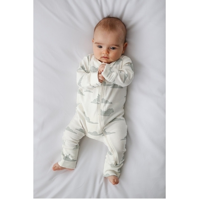 Keywords: organic baby sleepwear, baby zip onesie, gender-neutral baby outfit, winter babywear, cloud print babywear, New Zealand baby clothing