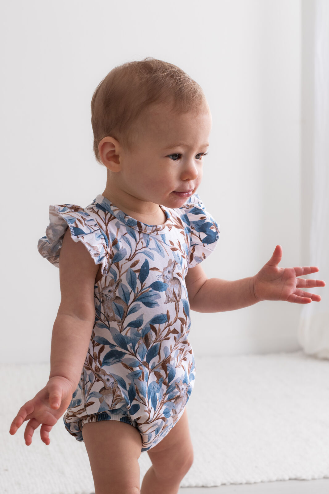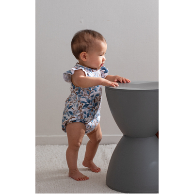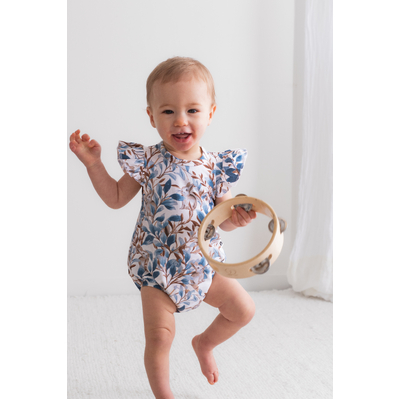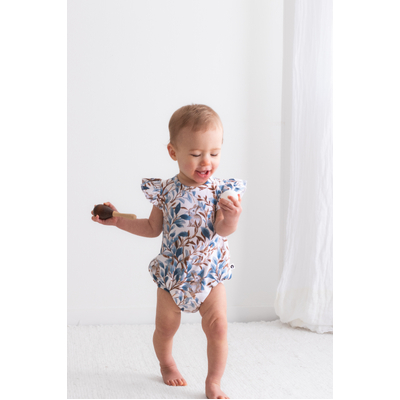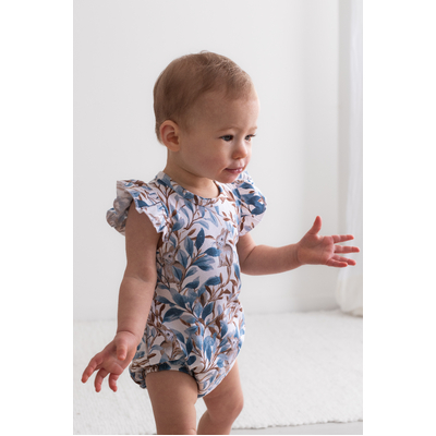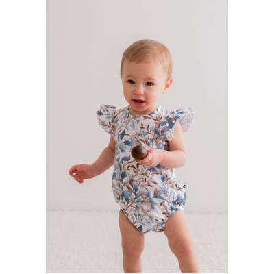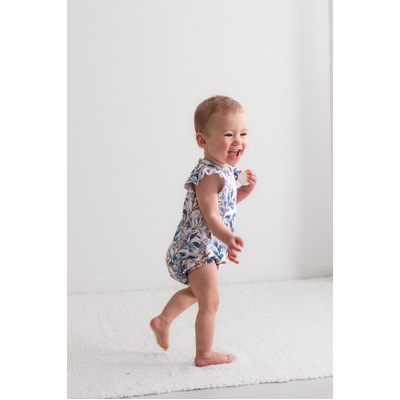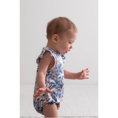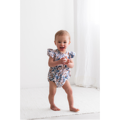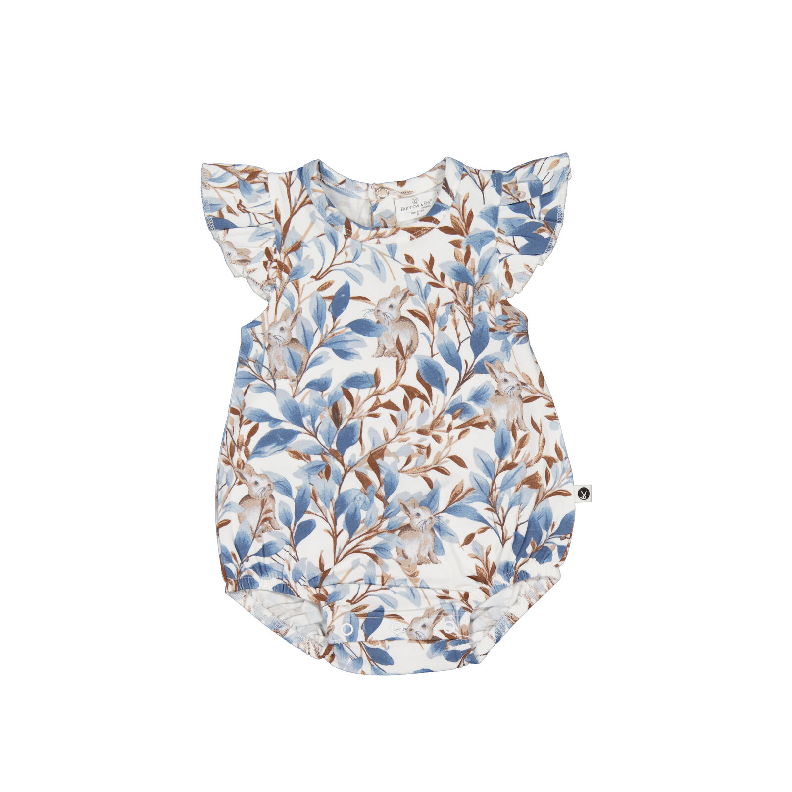 Adorable and functional, our Eden Flutter Bubble Romper is a playful piece for little ones. Vine-inspired prints and a hidden bunny motif create a whimsical design in rich blues and browns.