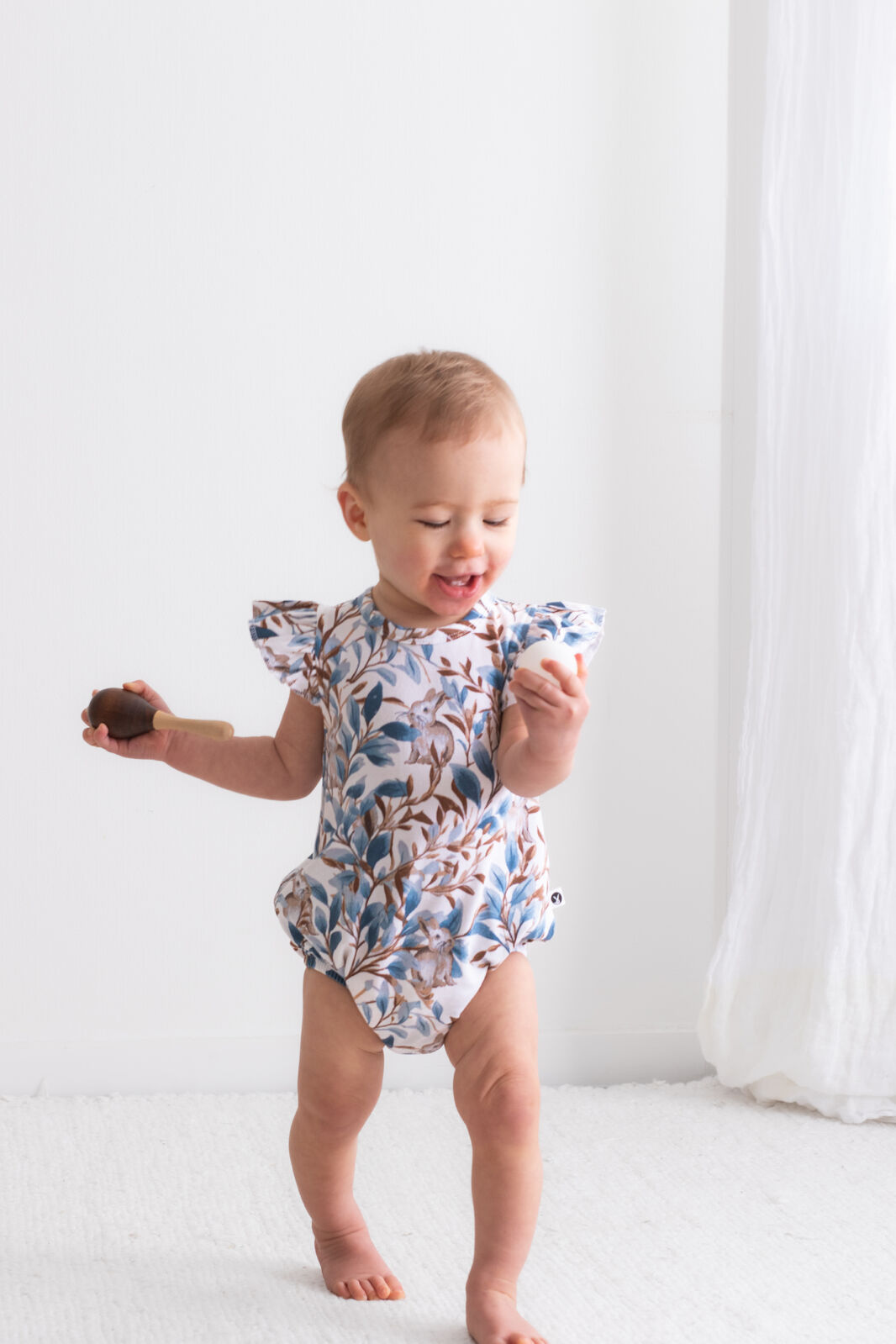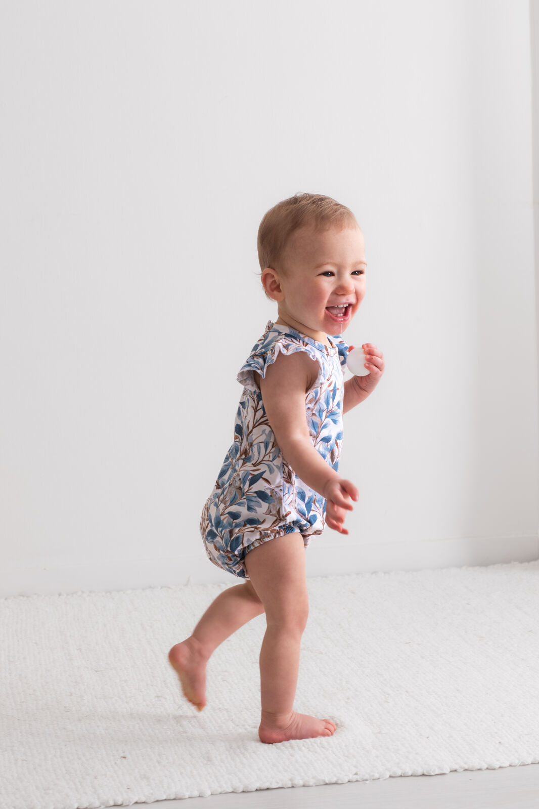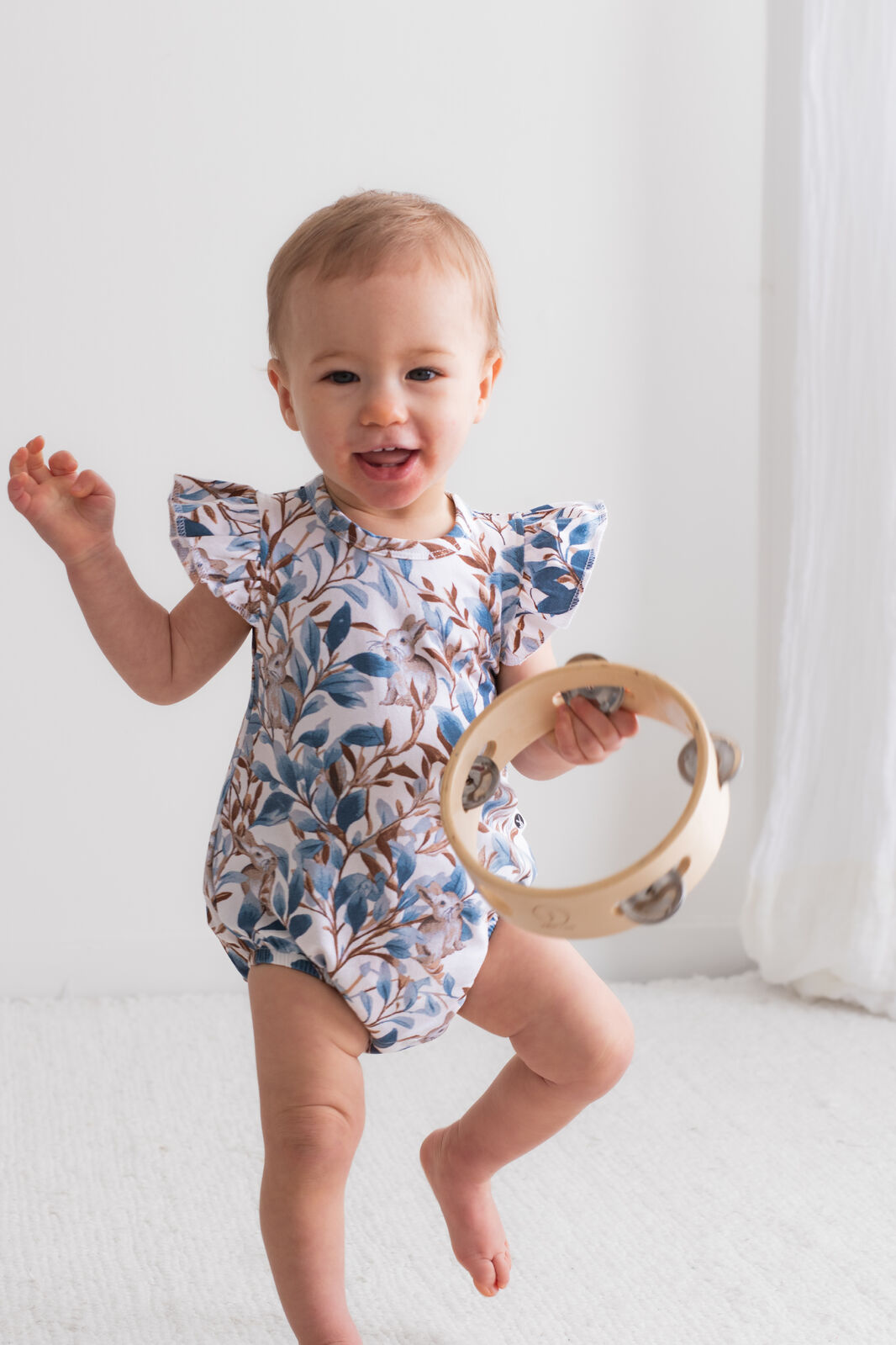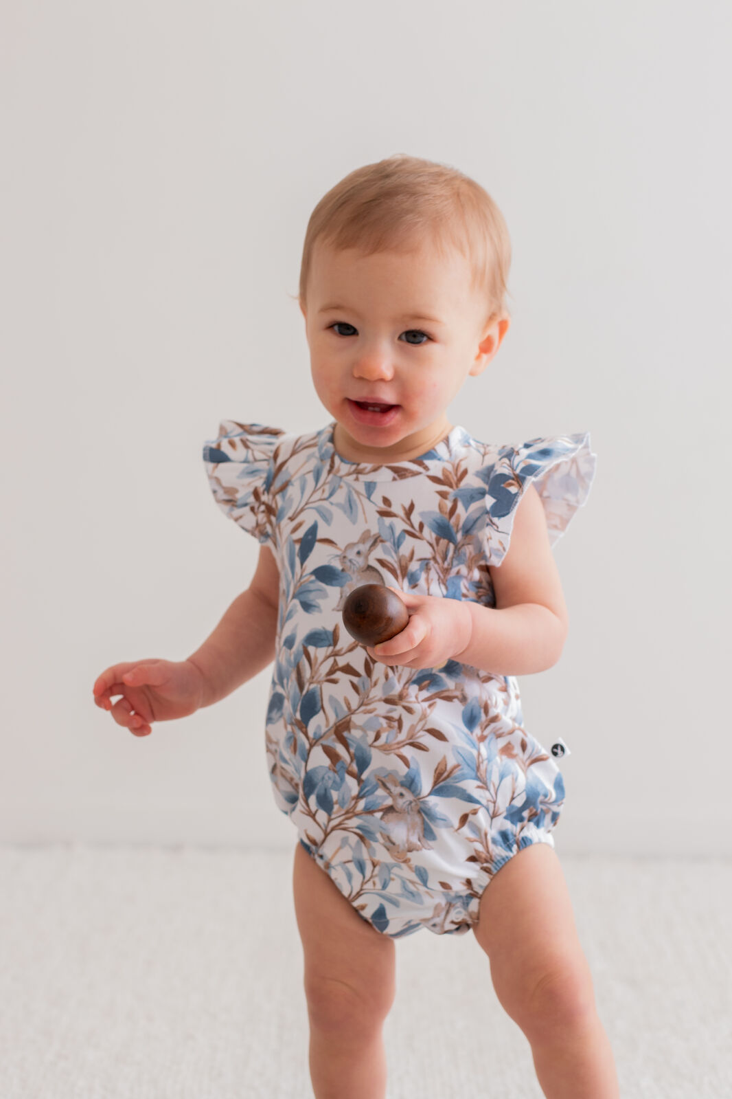 Adorable and functional, our Eden Flutter Bubble Romper is a playful piece for little ones. Vine-inspired prints and a hidden bunny motif create a whimsical design in rich blues and browns.