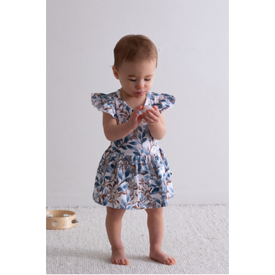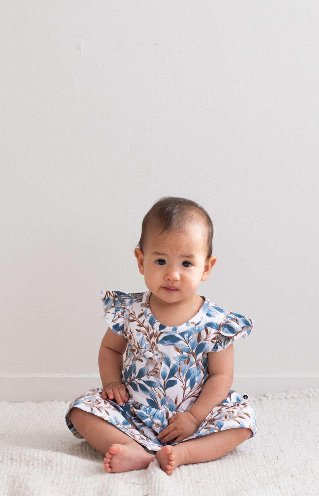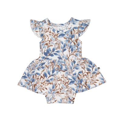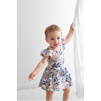 Soft, elegant, and charming, the Eden Flutter Baby Dress features a delicate vine and bunny print in blue and brown tones. A form fitting style with flutter sleeves and built in bodysuit make it comfortable for everyday wear and special occasions.