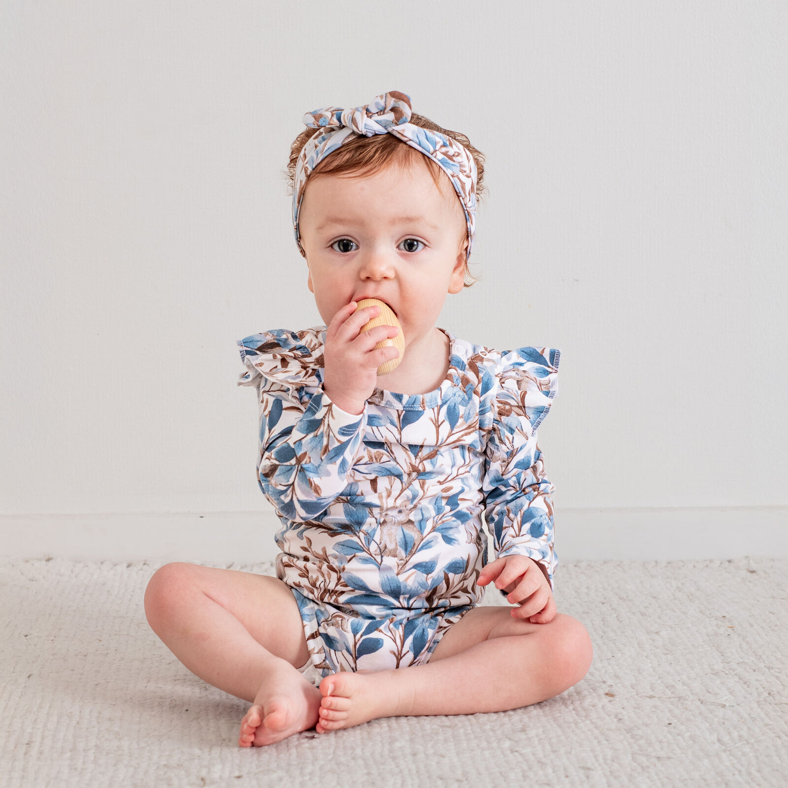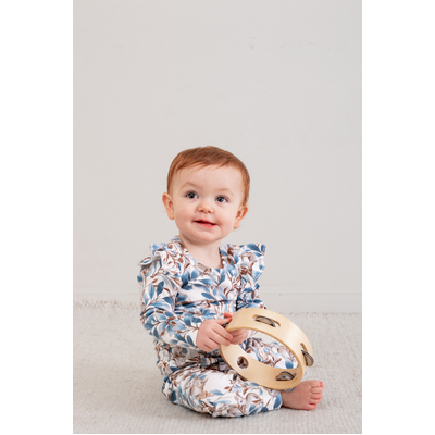 Our Eden Long Sleeve Flutter Bodysuit brings delicate charm to everyday wear. Featuring subtle foliage vines and a shy bunny motif in rich blues and browns, this bodysuit is pretty without relying on pink tones.