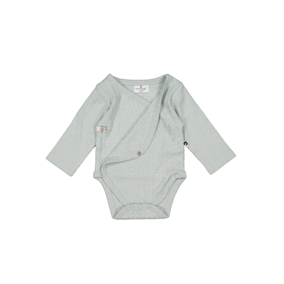 Keywords: long sleeve baby bodysuit, organic cotton kimono bodysuit, breathable pointelle knit, newborn essentials, pastel blue-green babywear, cozy baby clothing