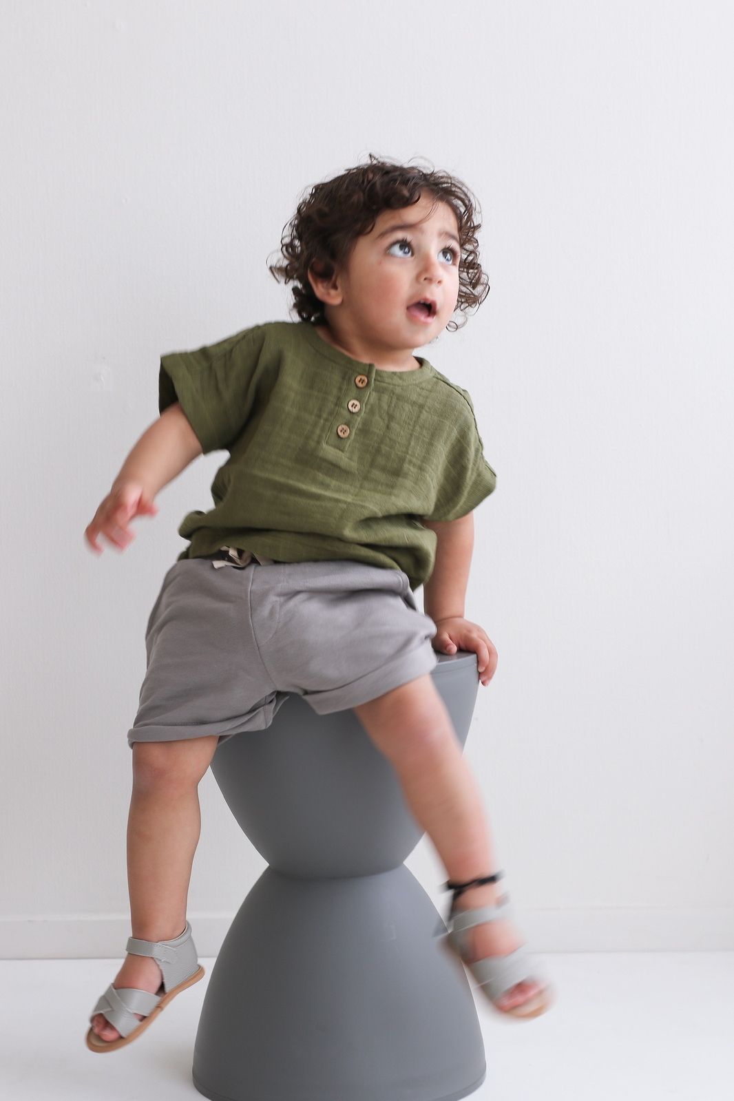 Our new Jasper short sleeve kids t-shirt is made for summer and beyond! Slightly dressier for all the summer events you have lined up, you will love it in our Olive colourway with the cute button detailing on the front.