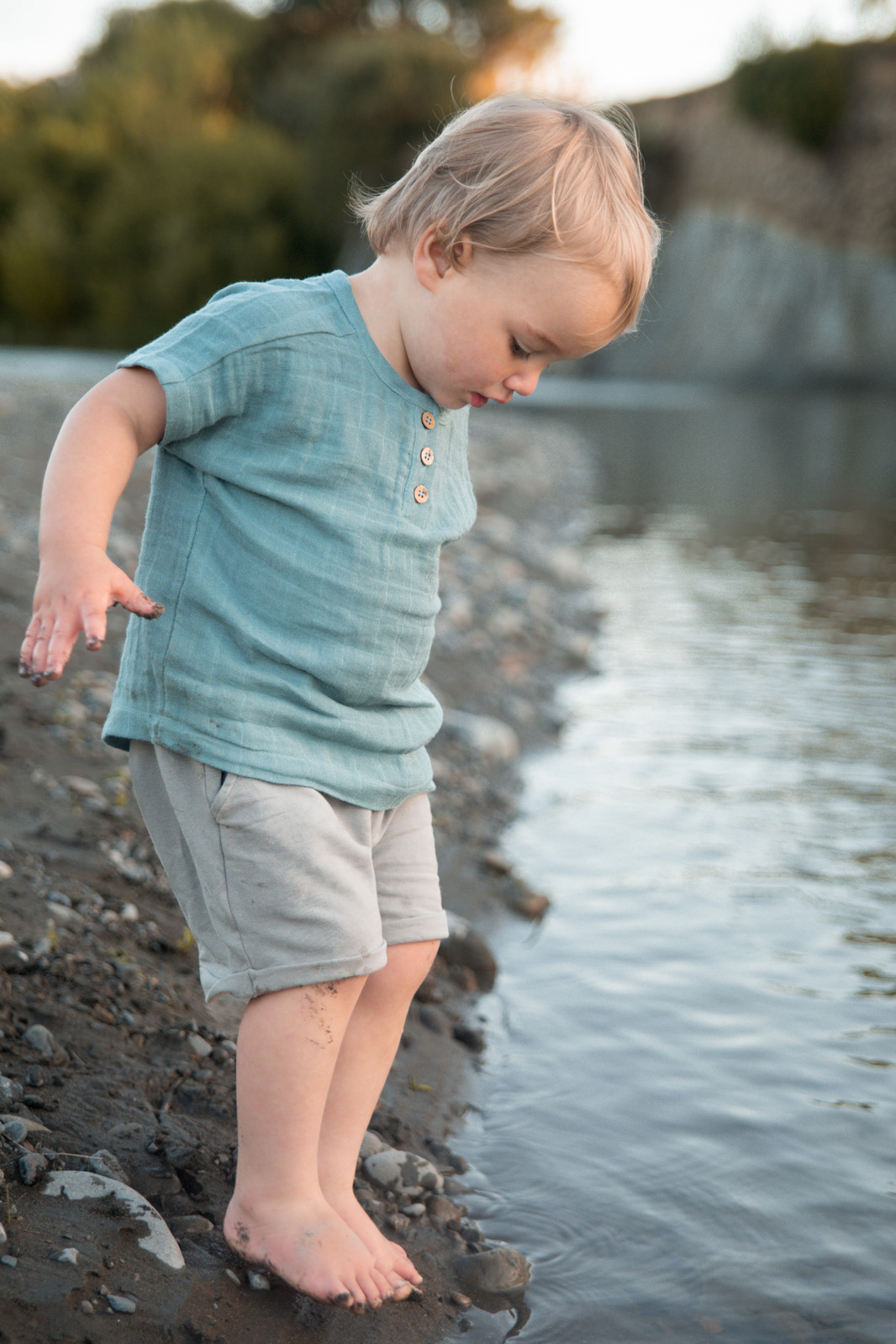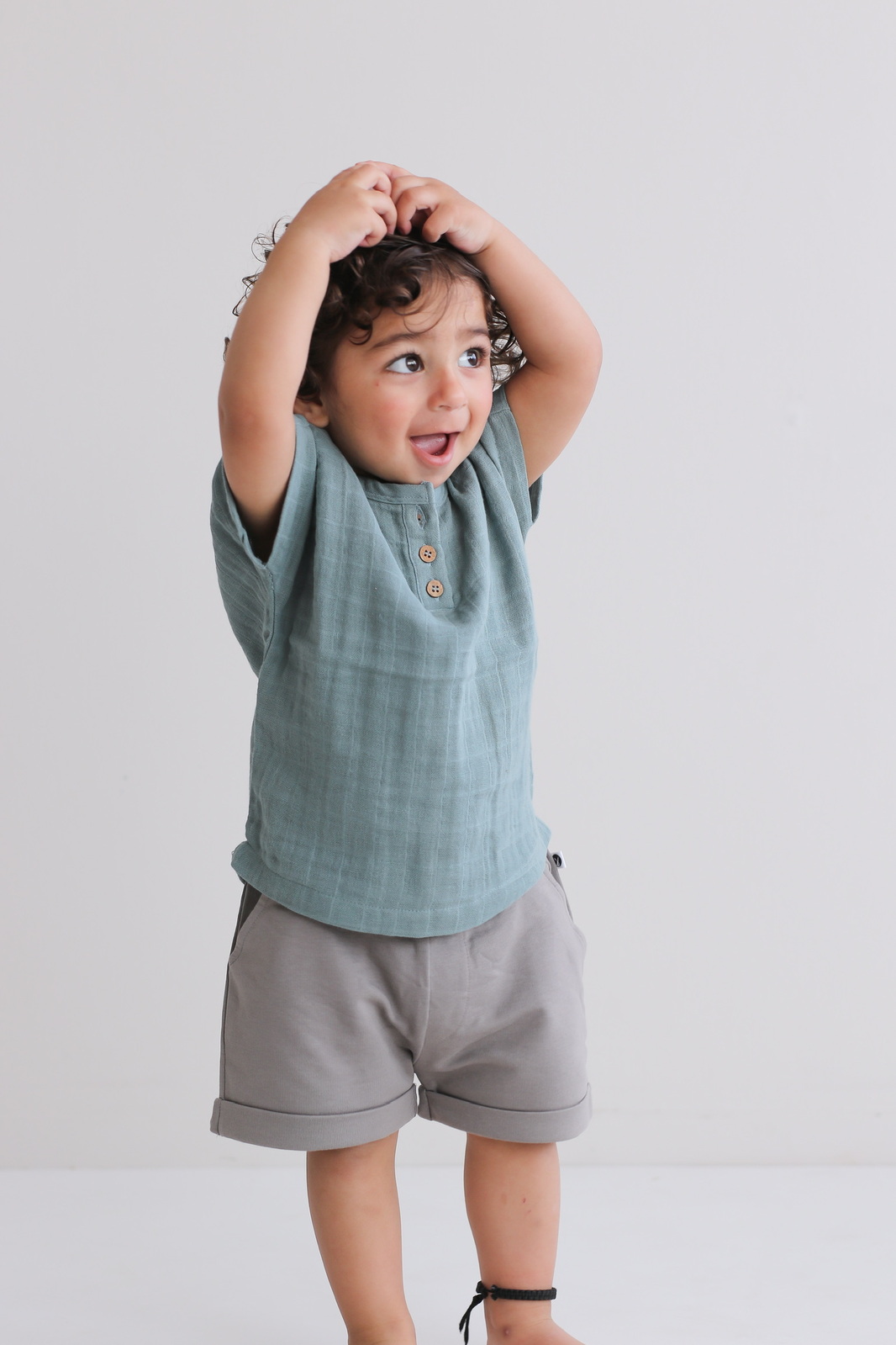 Our new Jasper short sleeve kids t-shirt is made for summer and beyond! Slightly dressier for all the summer events you have lined up, you will love it in our Storm colourway with the cute button detailing on the front.