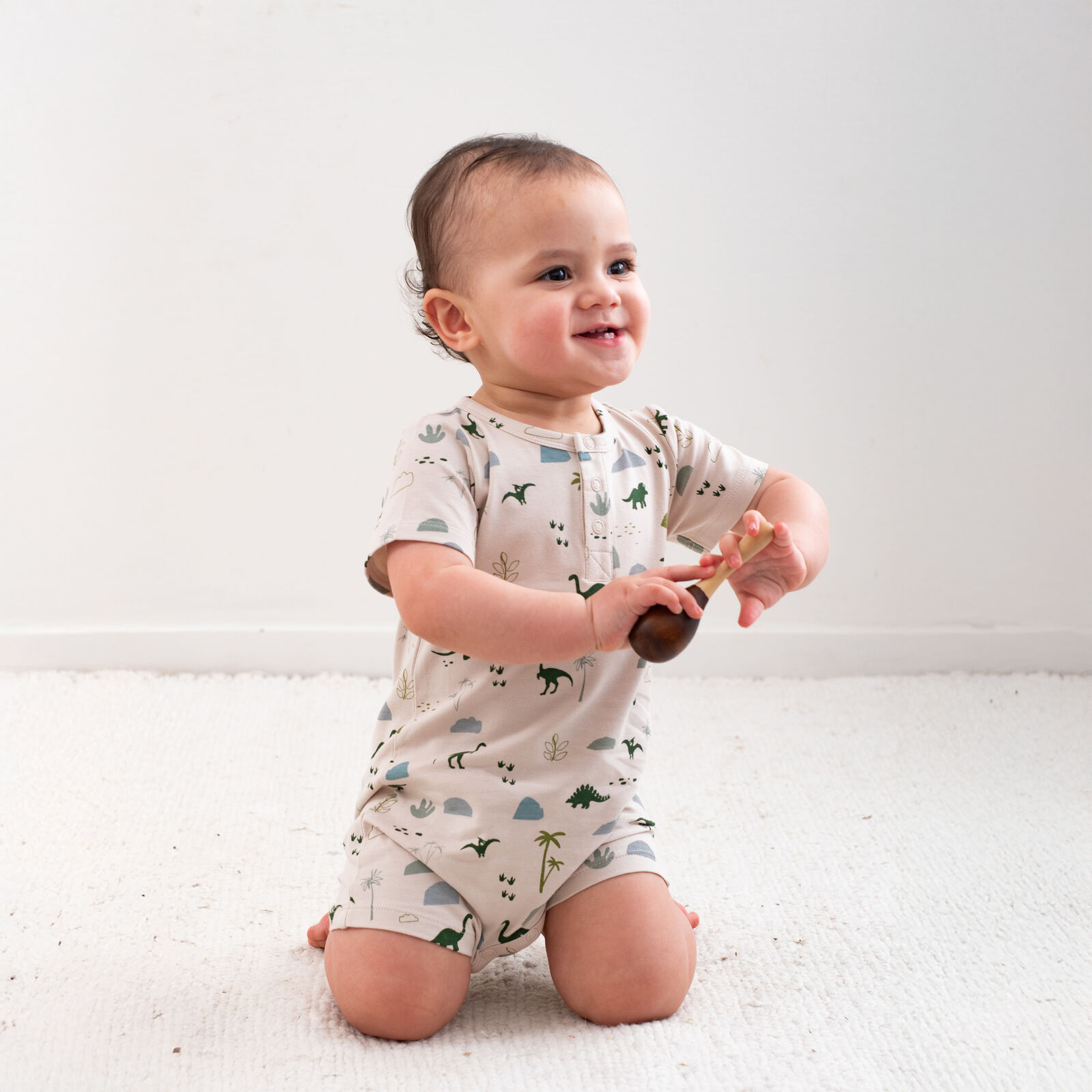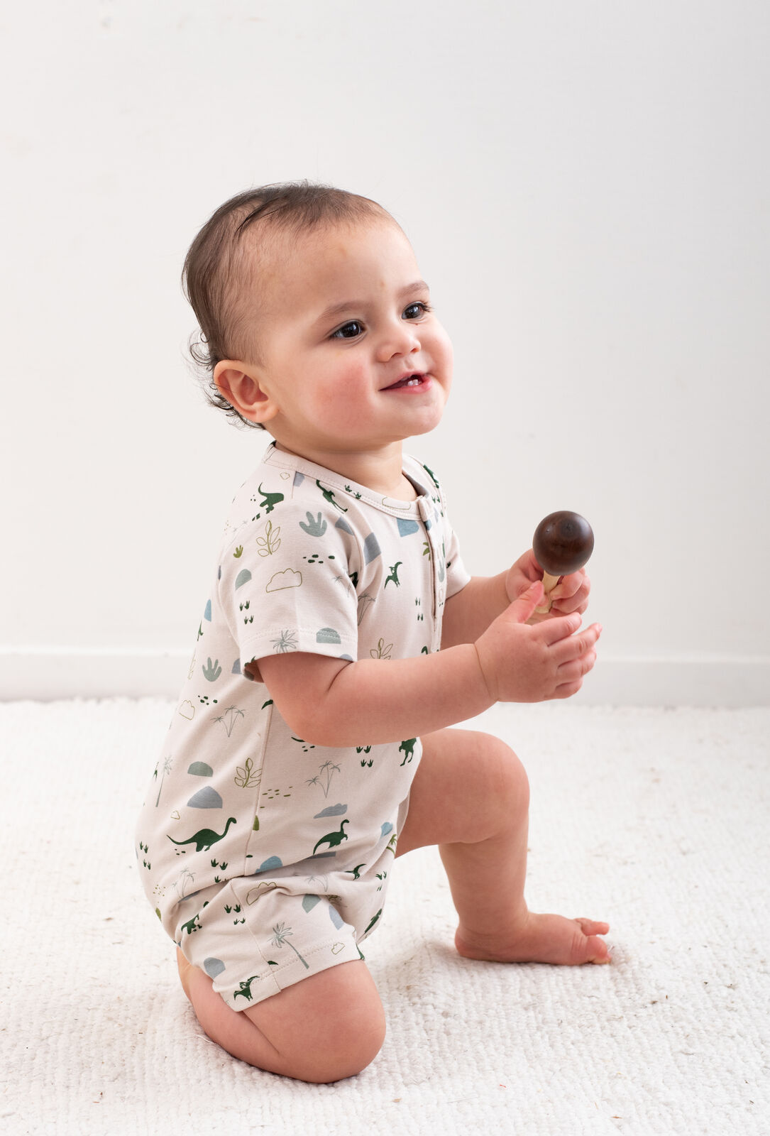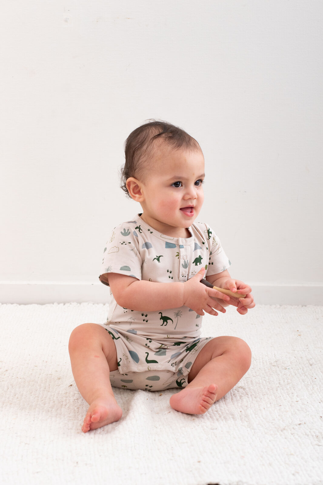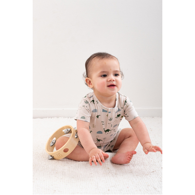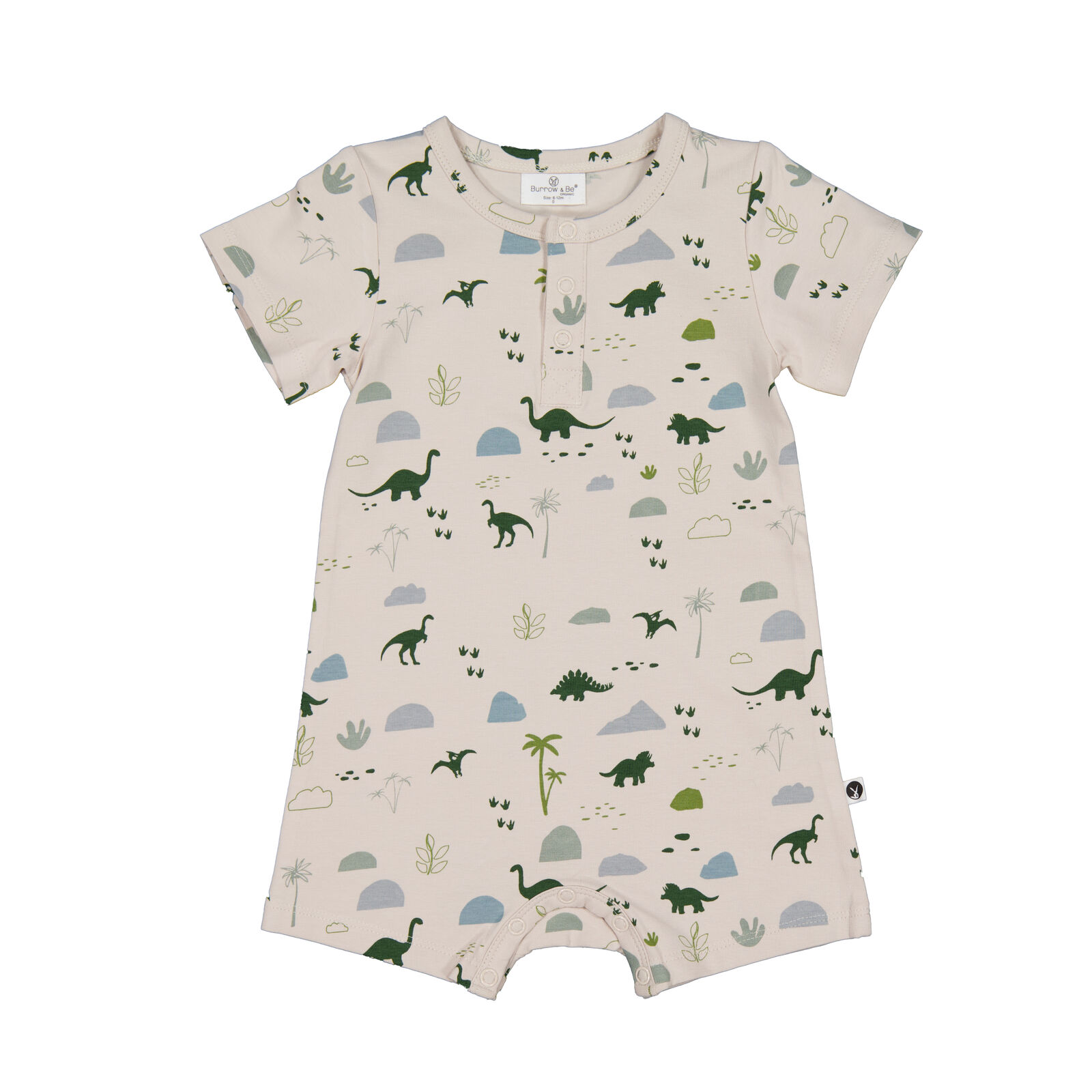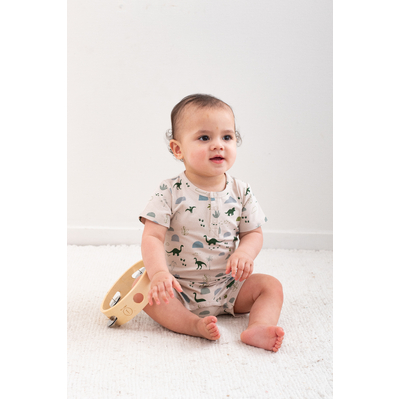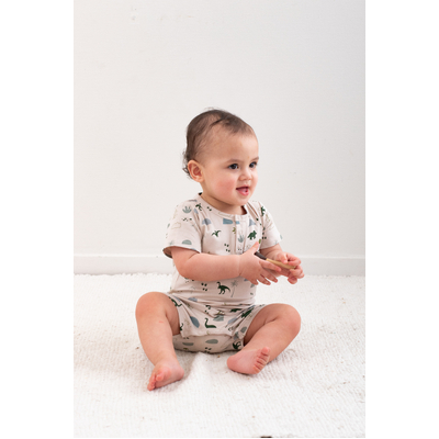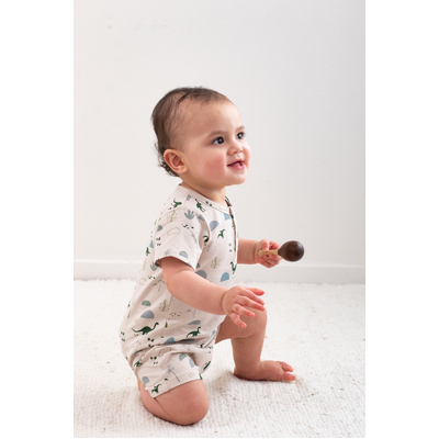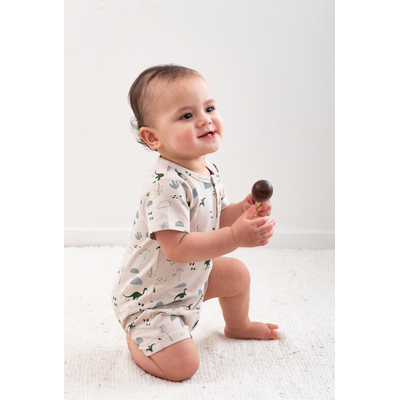 The Alex Romper in our Jurassic Roam print is the ultimate all-in-one outfit for babies on the move. With its earthy dinosaur design and easy-fit style, it's both practical and adorable.