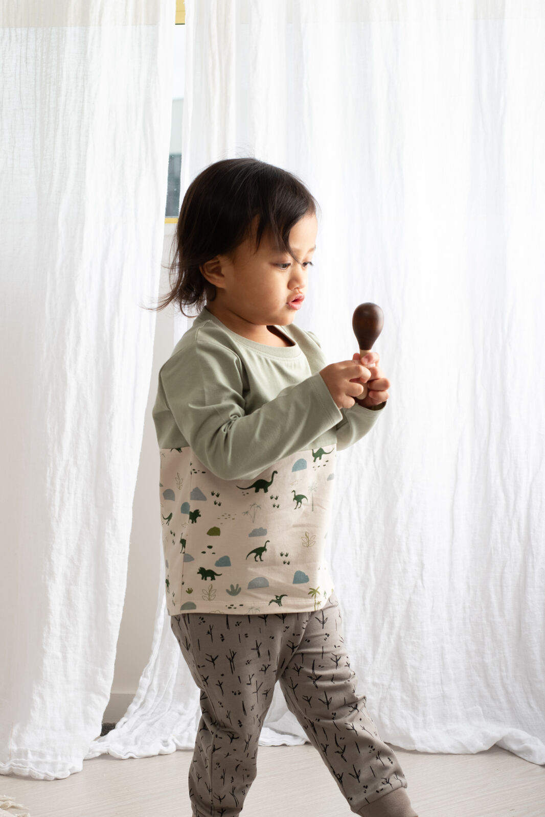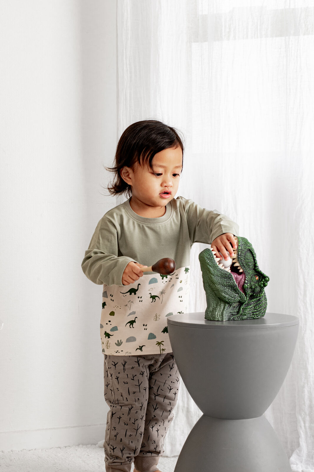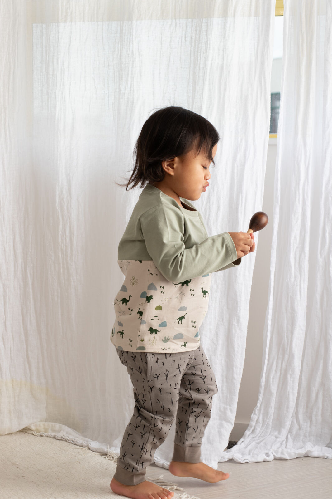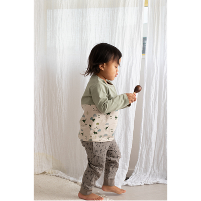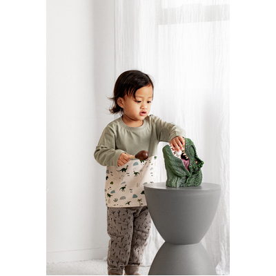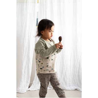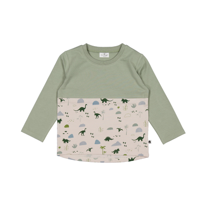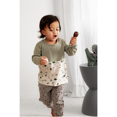 The Jurassic Roam Block Long Sleeve T-Shirt is the ultimate mix-and-match piece, with our seagrass colour on the sleeves and chest and dinosaur print around the body. Made from our signature organic cotton elastane fabric, this top offers softness and stretch for active little ones. It's perfect for layering or wearing on its own for everyday adventures.