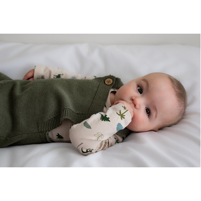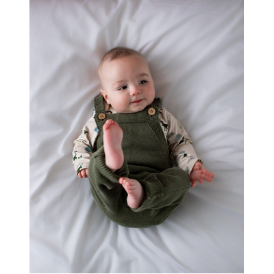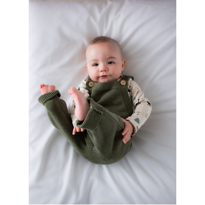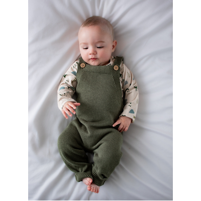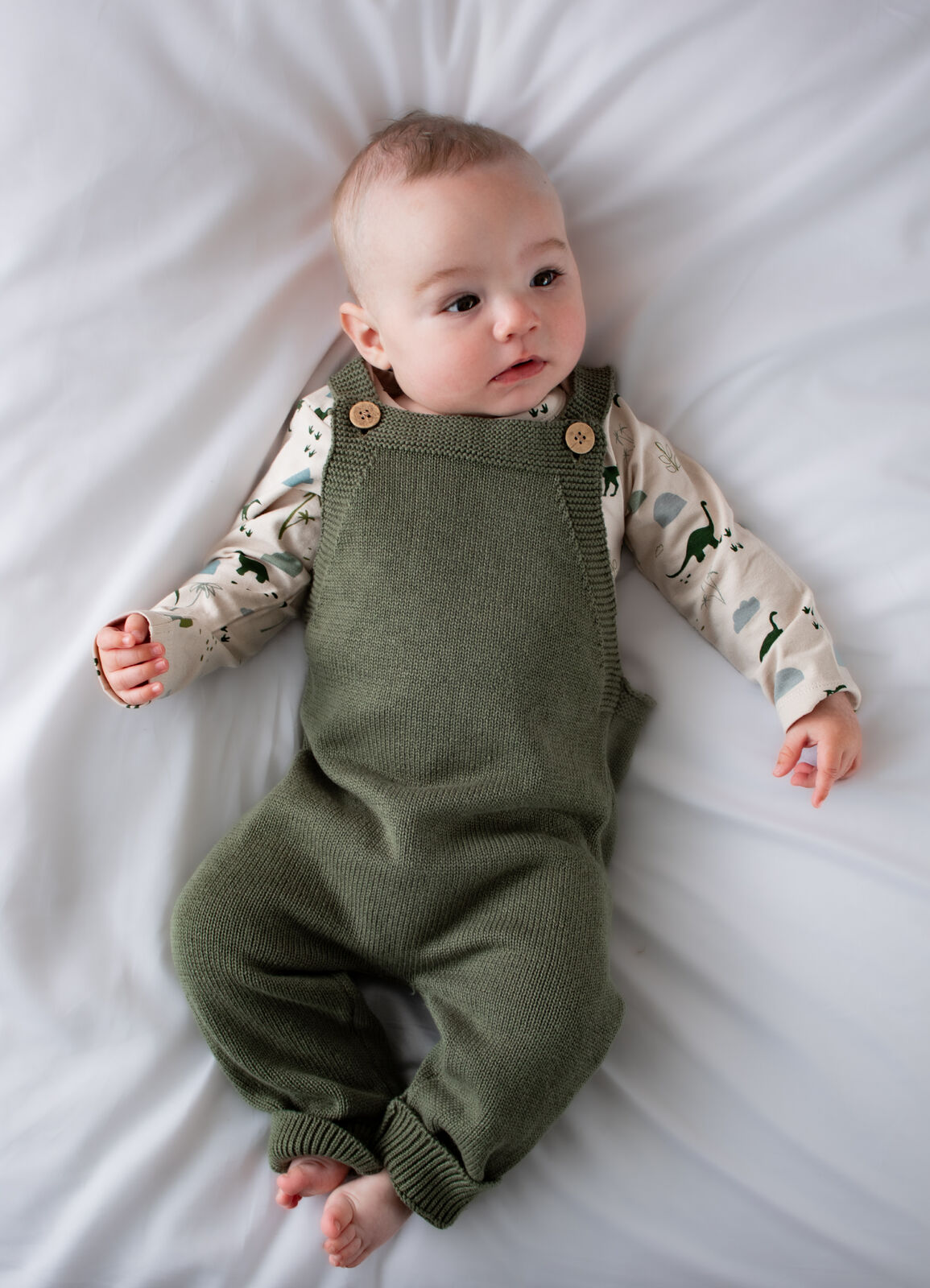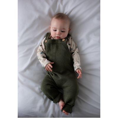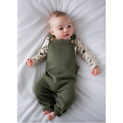 The rich, earthy hunter green hue makes them a perfect gender-neutral choice, while thoughtful details like adjustable straps with two buttonholes and coconut buttons ensure a comfortable, long-lasting fit. Layer over our Jurassic Roam bodysuit or mix and match with other pieces in the Burrow and Be collection for endless outfit options.