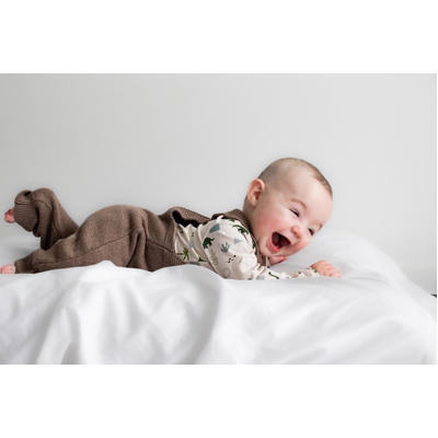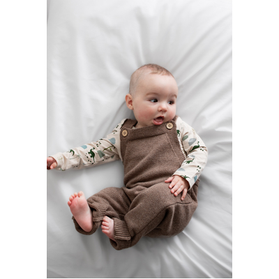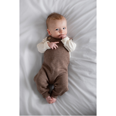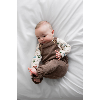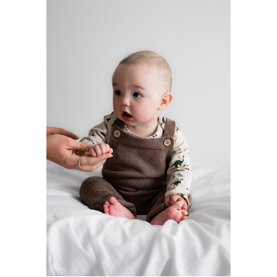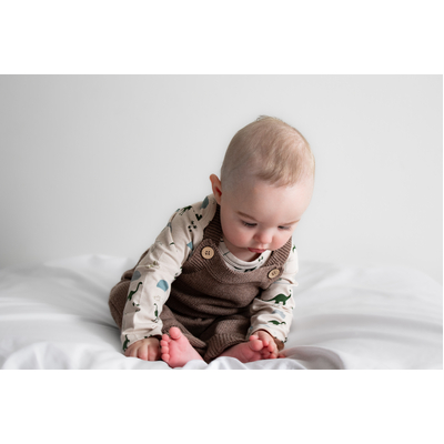 Made from our premium cotton cashmere blend (95% cotton, 5% cashmere), these overalls feel luxuriously soft and are perfect for cooler days. The ash brown Umber tone is a beautiful earthy neutral, easy to style and perfect for layering. Features include adjustable straps with two buttonholes for growing room and natural coconut buttons for a classic finish. Pair with our Eden or Jurassic Roam bodysuits, or layer with knits for a cosy winter look.