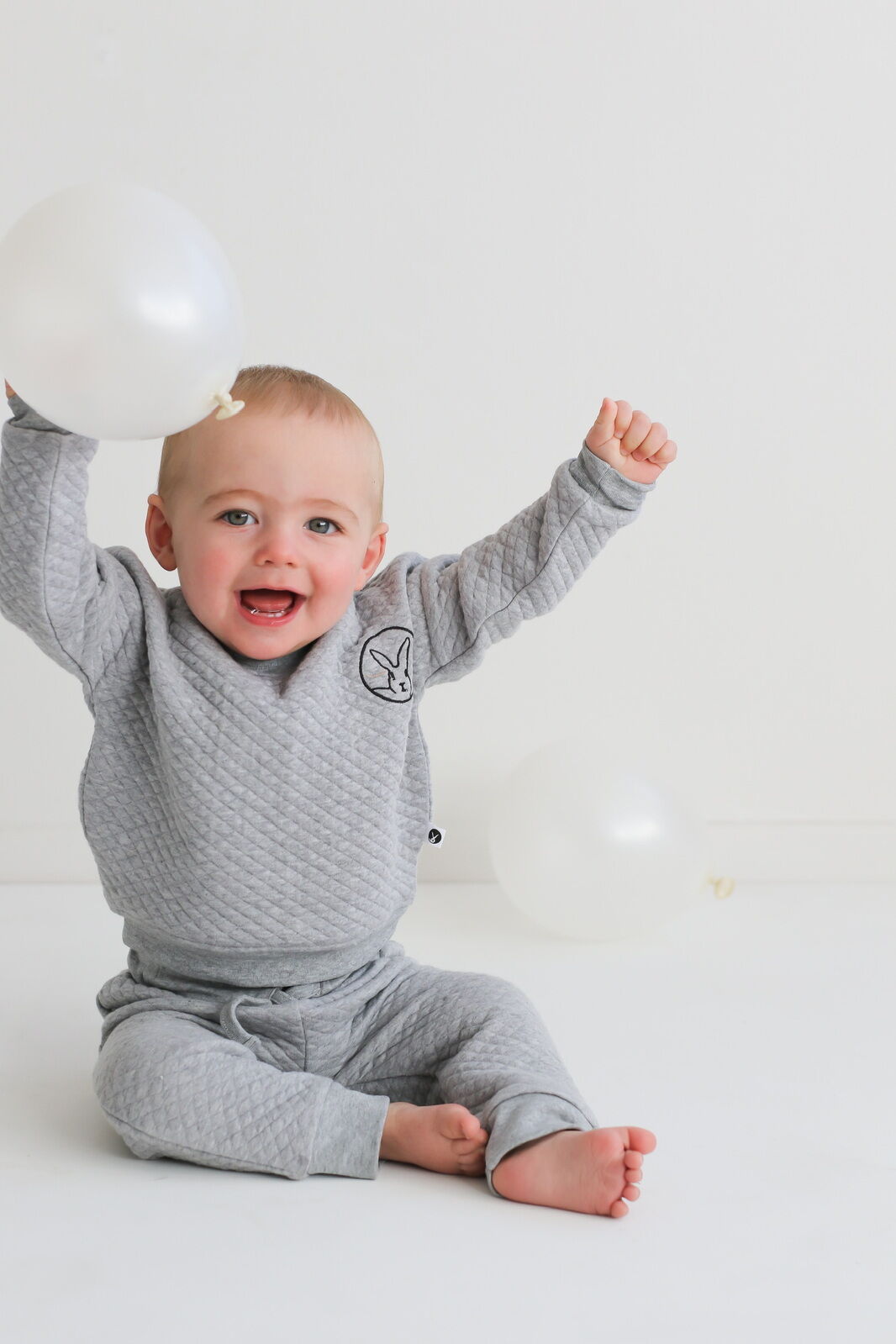 Quilted Interlock Knit Riley Sweater and pants in timeless Grey Melange. Crafted with love and featuring an embroidered Burrow and Be bunny this sweater is designed to be slouchy yet still keep your babies and children warm and looking stylish.